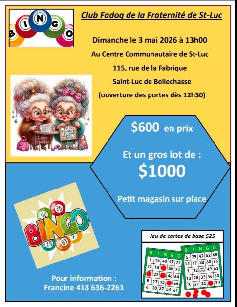 Centre communautaire de St-Luc-de-BellechasseErratum - l'événement est le 3 mai et non le 10 mai. Jeu de carte de base: 25$ Ouverture des portes 12:30 Petit magasin sur place Plus de 1500$ en prix Venez vous amuser! Note: 18 ans et plus Information Francine: 418-636-2261