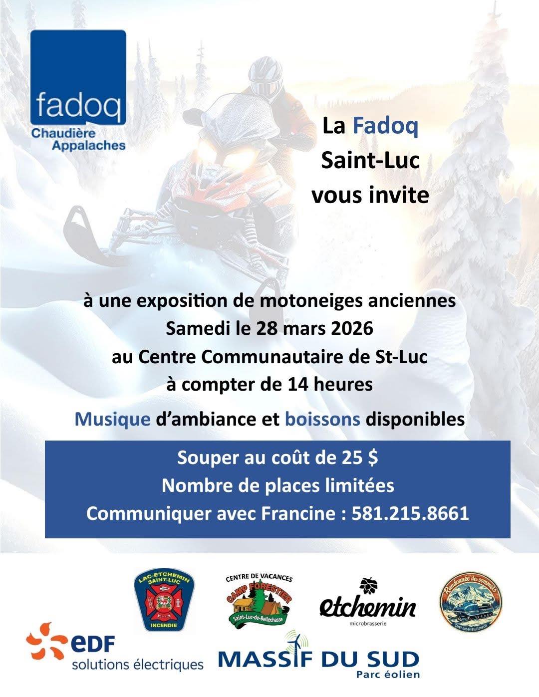 Centre communautaire de St-Luc-de-BellechasseÀ partir de 14:00 Exposition de motoneiges anciennes Vers 17:30 Souper préparé par la FADOQ Musique d'ambiance et service de bar sur place. N'oubliez pas de réserver AVANT le 15 MARS - places limitées Francine Trépanier : 581-215-8661