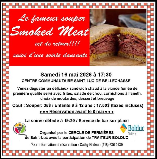 Centre communautaire de St-Luc-de-BellechasseSouper Smokedmeat & Danse/Karaoké Souper/ criée du Cercle des Fermières apporter vos $ c'est pour une bonne cause, suivi d’une soirée dansante/Karaoké TARIF : 35$/adulte Tarif enfant 17.50$ Places limitées - RÉSERVEZ au plus tard le 10 mai auprès de Mme Cathy Nadeau 418-636-2730 Endroit : Centre communautaire de la municipalité St-Luc Organisé par le Cercle des Fermières Coupon rabais de 5$/client du…