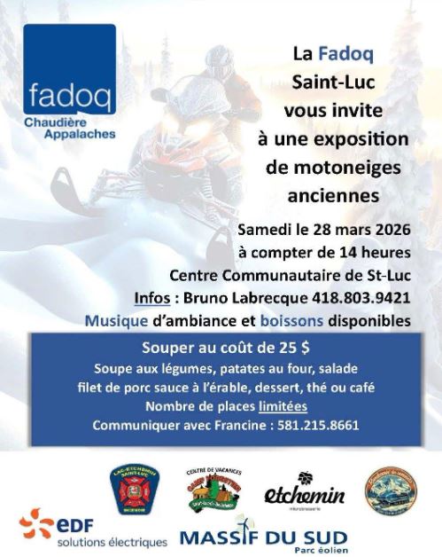 À partir de 14:00  Exposition de motoneiges anciennes Vers 17:30 Souper préparé par la FADOQ Musique d'ambiance et service de bar sur place. N'oubliez pas de réserver AVANT le 15 MARS - places limitées Francine Trépanier : 581-215-8661 Tarif: Enfant 6  à 12 ans 10$ Enfant 2 à 18 ans 15$ 18 et plus 25$